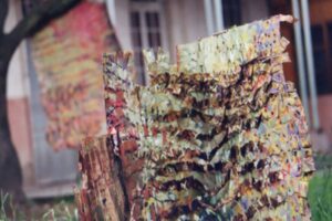Los camuflajes pictóricos, se realizaron siguiendo el principio del collage, sobreponiendo y rasgando imágenes, colores, materiales (telas, papel, pintura), se pegan se cosen, se sostienen a sí mismos, la pintura deviene objeto que se construye desde el reconocimiento de la presencia del cuerpo en tensión con la escala y el peso de los materiales en donde la presencia psíquica actúa bajo el azar, la indeterminación y lo imprevisible. La superposición de capas de papel en los camuflajes crean objetos que se ubicaban en los límites de los soportes bidimensionales, así la pintura se cuelga, sostiene,  se suspende de la pared, la columna o en el piso del espacio de la galería, tensionando la lógica espacial del cuadro. En su totalidad, esta lógica hacia el objeto o la instalación se resolvía mediante el empleo del color, la gestualidad y uso de recursos gráficos.